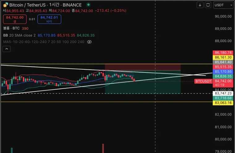 삼각수렴 캔들에 곧 추세선 이탈할것으로 판단하여 숏 포지션 진입하였습니다.