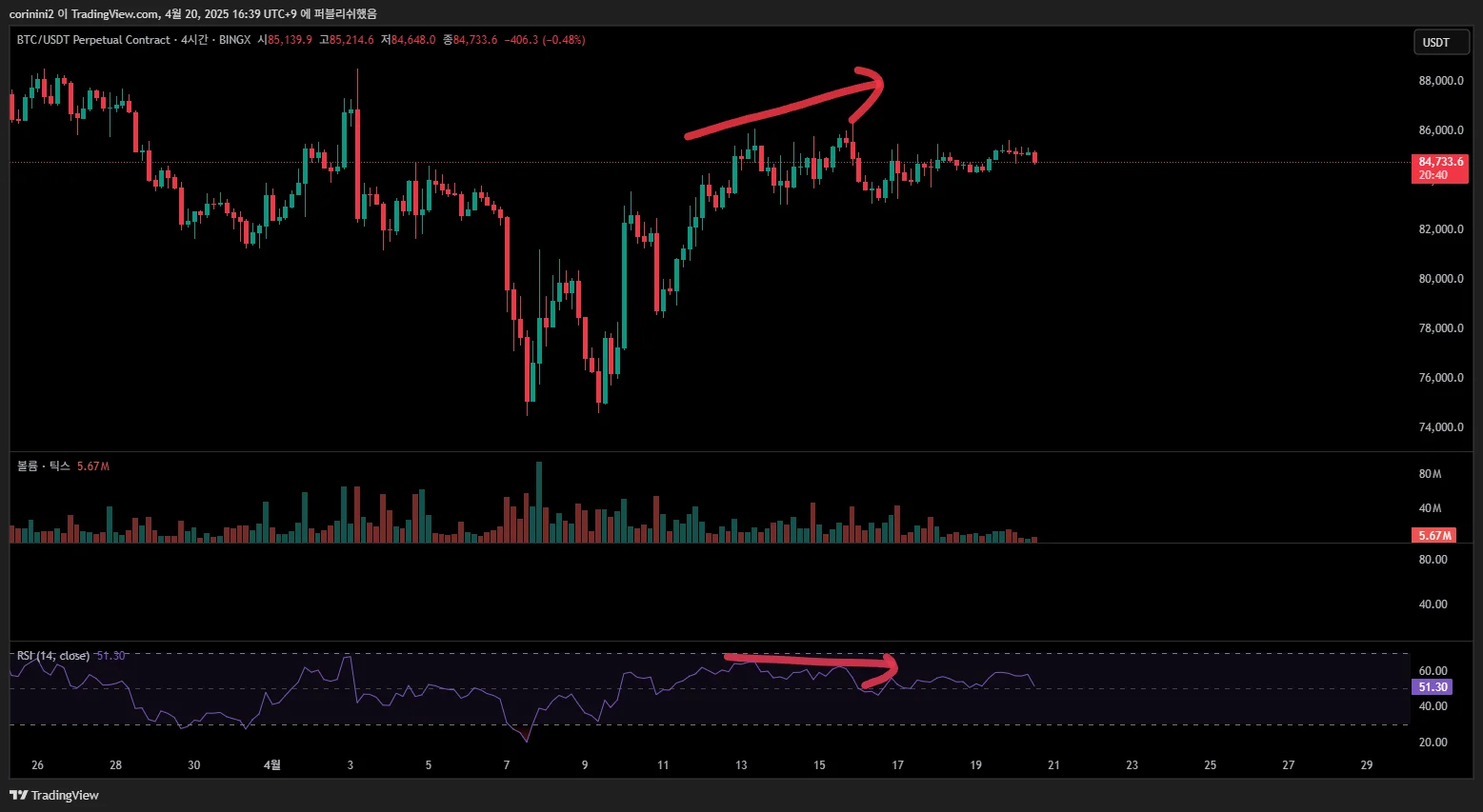 캔들의 고점은 상승하는데 RSI의 고점은 낮아지는 하락다이버전스 첨부하였습니다