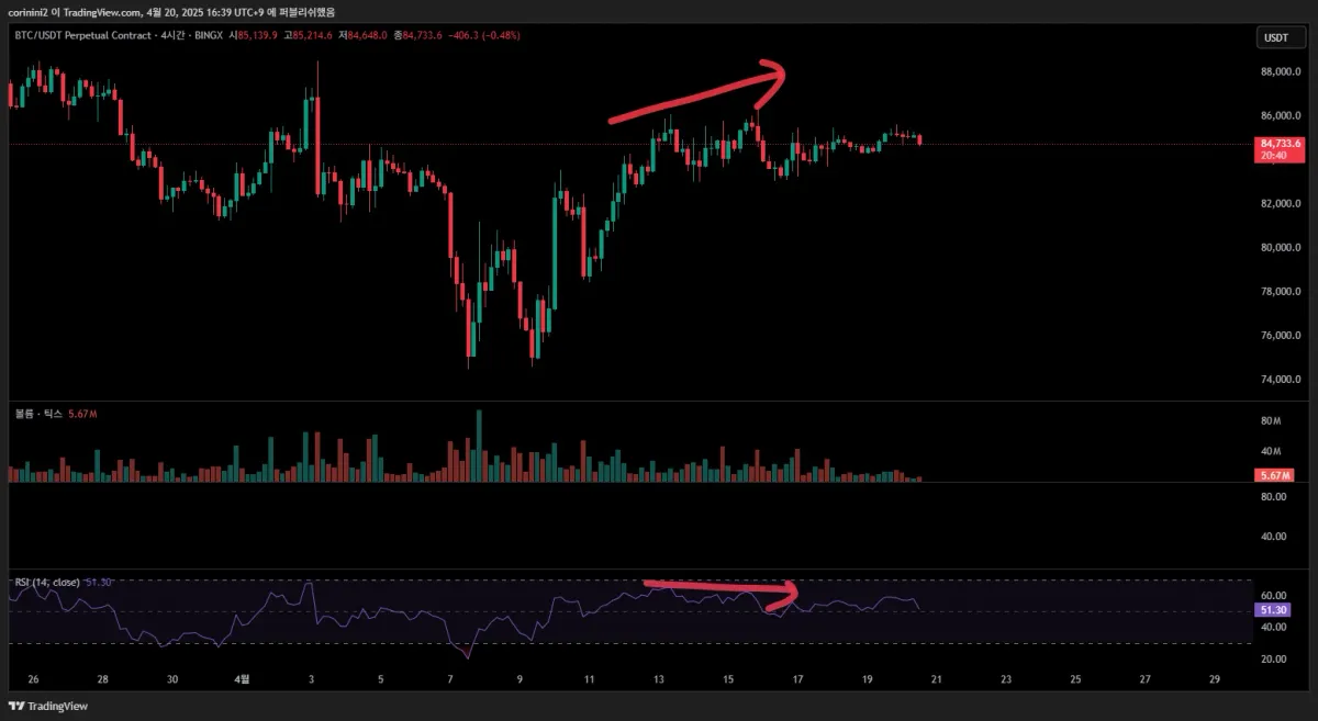 캔들의 고점은 상승하는데 RSI의 고점은 낮아지는 하락다이버전스 첨부하였습니다