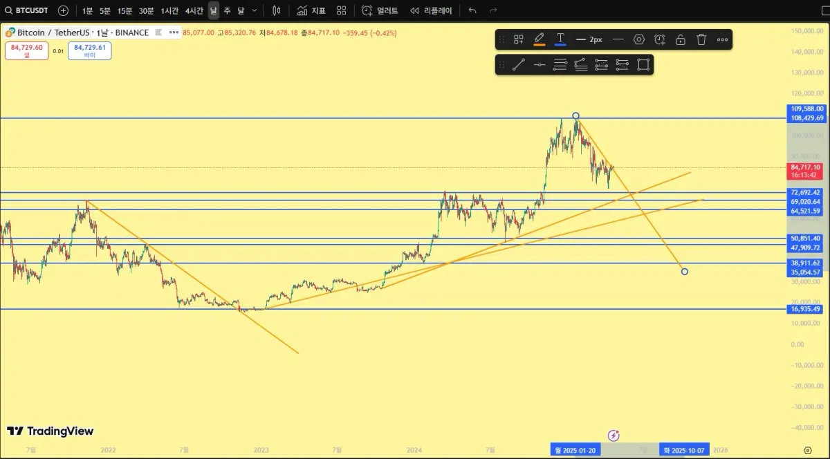 비트코인 일봉 트레이딩 뷰에서의 지지선/저항선/추세선 작도한 내역입니다.