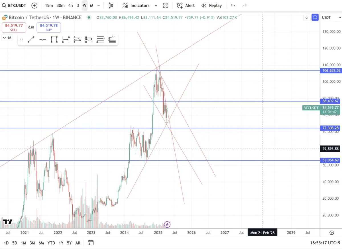 보여주신 차트에서는 ‘하락 채널’을 형성하고자 하는 의도가 보이는데, 이 경우 다음 순서로 접근하시면 좋습니다! 고점과 고점을 연결해서 하락 추세선 해당 추세선과 병행하는 형태로 하단 지지선 작도 이 둘 사이 공간이 하락 채널입니다 지금은 고점과 저점 연결이 살짝 비대칭이어서 채널로서 일관성이 약한데, 상단 고점 두 개, 하단 저점 두 개를 정확히 잡고 병렬 채널 형태로 정리하면 훨씬 더 선명해 지실 거에요!
