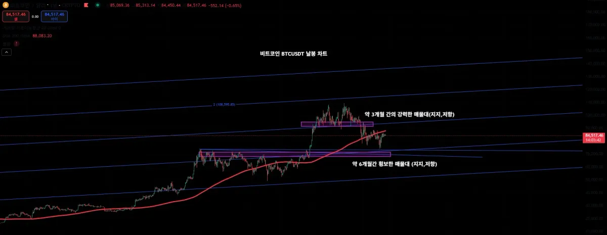 위와 같이 비트코인 지지,저항 작도 실습해봤습니다.