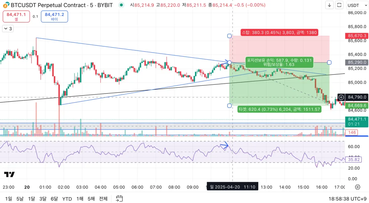 추세선 세 번째 터치 + 5분봉 하락다이버전스 출현하여 상승보다 하락에 유리할 거라 판단