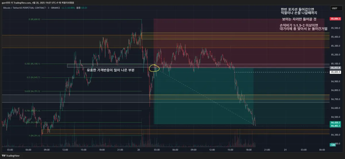 진입근거 : 기존 지지구간이 깨진 후에 돌아온다면 저항이 되지 않을까? 라고 생각하여 노란색 동그라미 부분에서 숏 진입