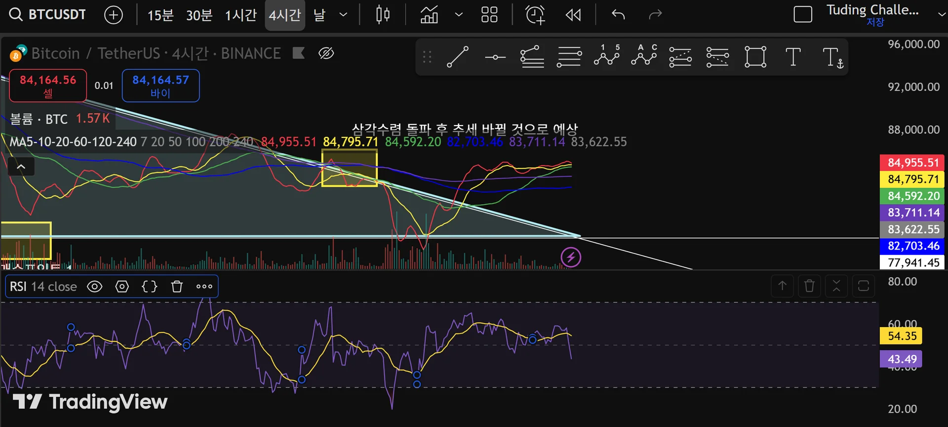 RSI 지표를 추가했을 때 나타나는 보라선과 노란선의 차이가 뭔가요?