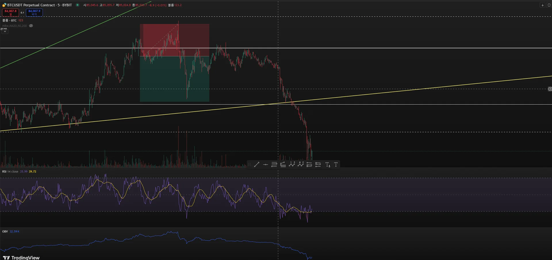 4월 19일 한국 시간 저녁시간 폴링웻지, rsi 하락 다이버전스 확인 후 숏포지션 진입 후 손절가를 전고점인 85373보다 230포인트 높은 85600 설정 후