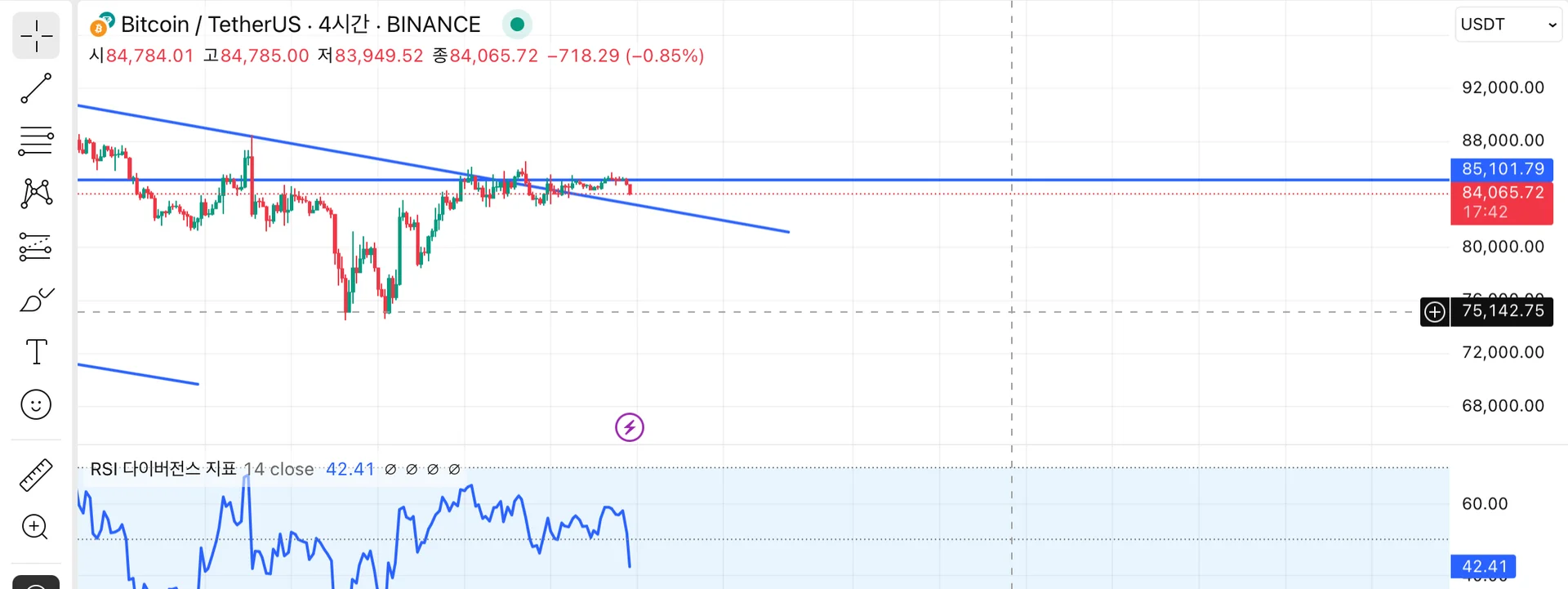 숏 진입 후 기다리는 중입니다. 현재 하방으로 보고 있고 4시간 봉에서 200일선 돌파 및 일봉상 200일 선 맞고 떨어지는 모습을 보여줍니다. 하락 가능성에 무게를 두고 있고 손익비가 좋은 자리 같아 진입했어요. 최근 진입할 만한 구간이 보이지 않는 가운데 부디 수익안겨주길 기대합니다.