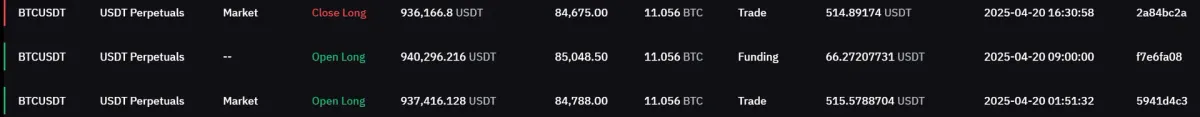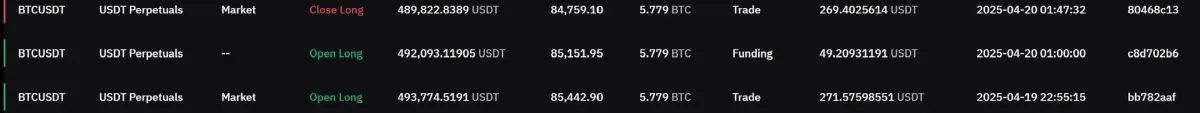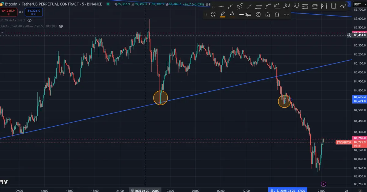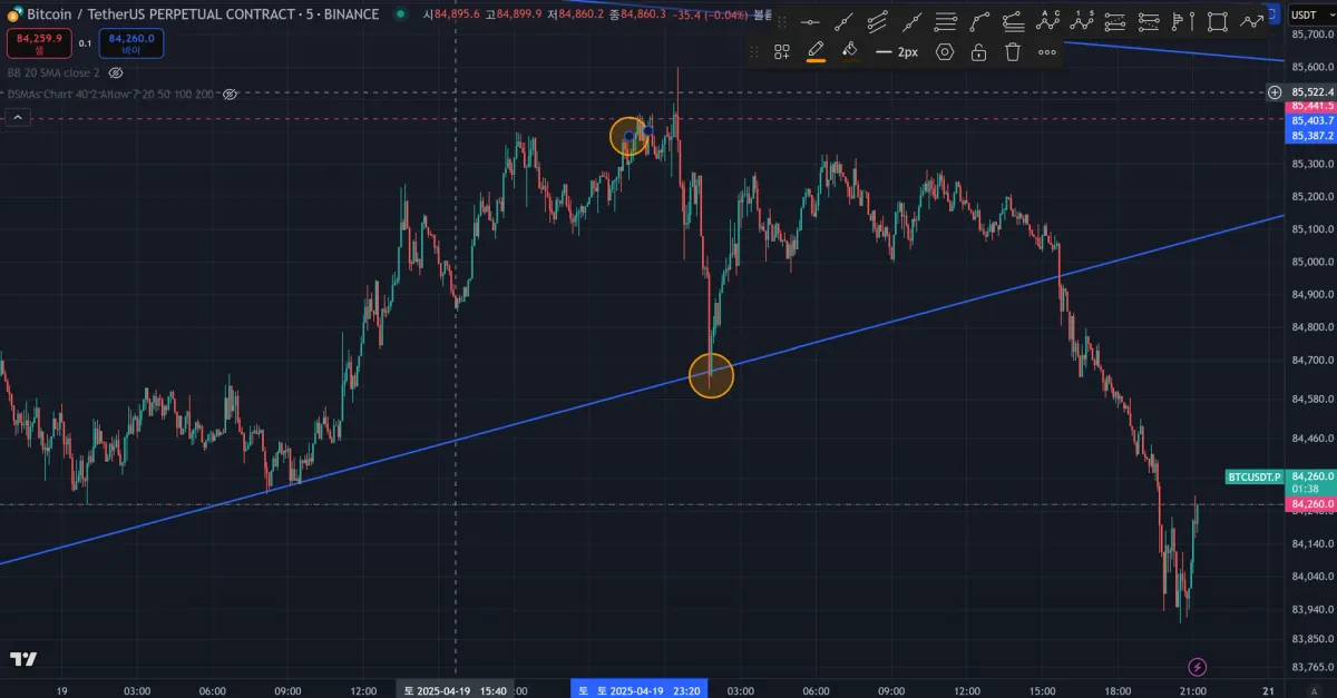 TP/SL은 86351(전고점)/84759(하단추세선)로 설정했지만 하단추세선에 닿아서 손절이 나갔습니다.