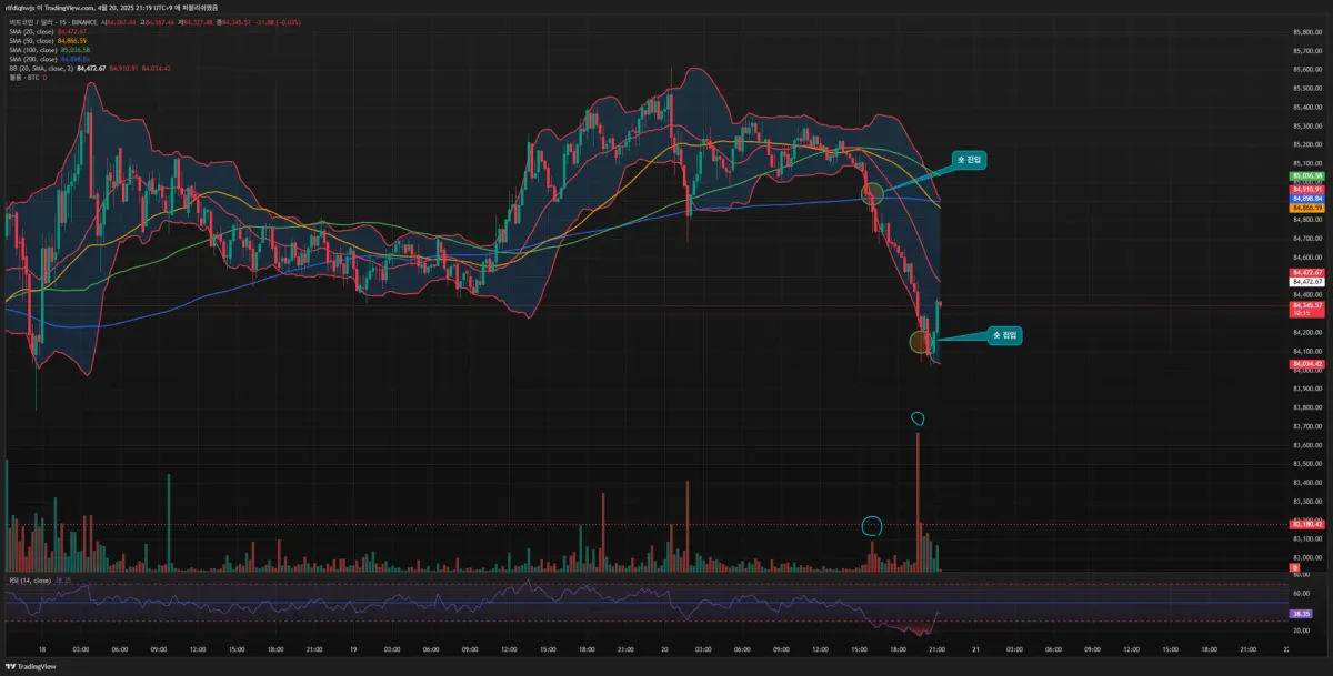 전체적으로 하방을 주로 보고 있었고 15분봉 음봉 캔들 확인 후 첫번쨰 숏 진입하여 수익 후 두번째 숏 진입하여 현재까지 손실을 보고 있습니다