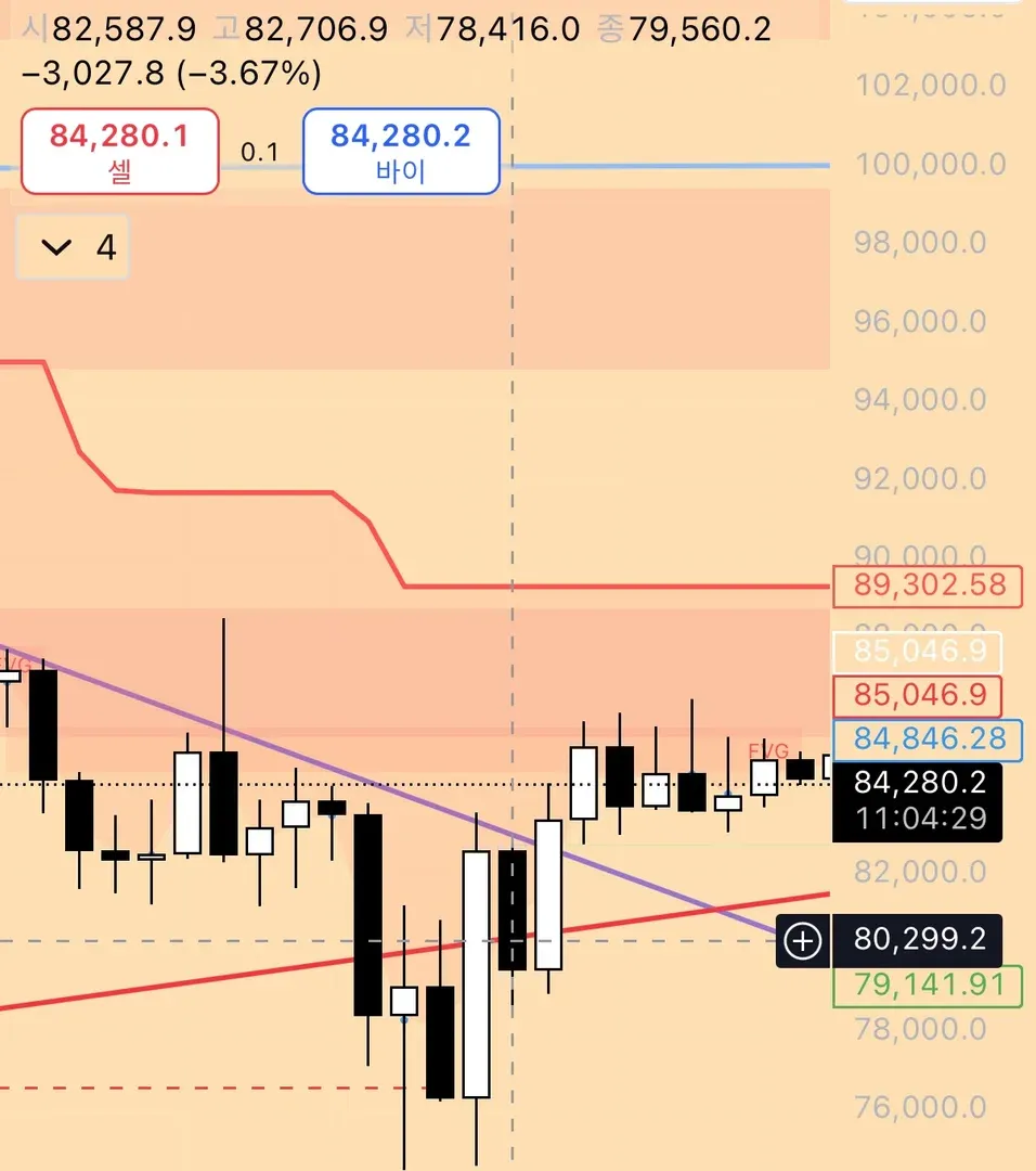 일봉상 80000 돌파 후 다시한번 80000이 깨져 숏 진입 하였으나 회복하면서 84000대 유지중