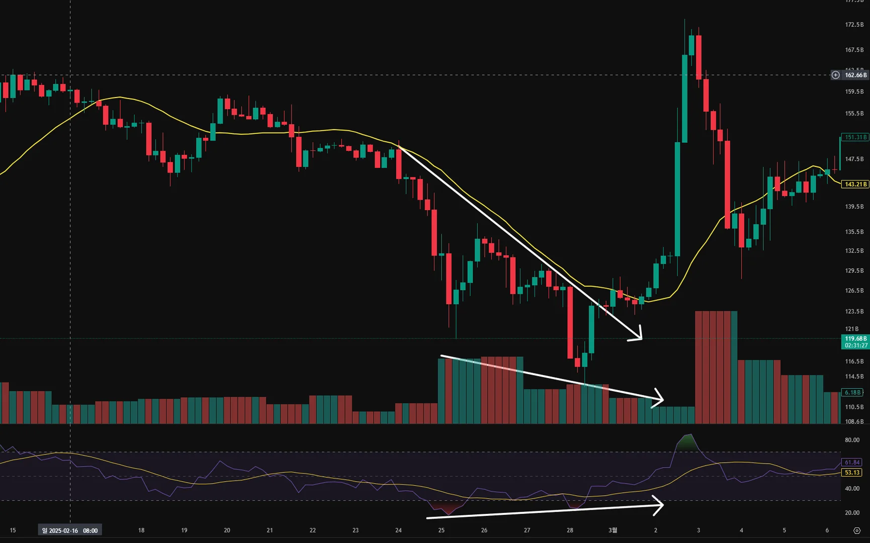 먼저 첨부하신 차트에서 보이는 부분은 RSI 지표의 상승, 가격의 저점 갱신, 거래량 증가라는 조합을 통해 전형적인 상승 다이버전스를 예시로 잘 표시하셨습니다. 여기서 거래량과 RSI의 관계를 구체적으로 연결해서 이해하는 것이 중요합니다. 하락 다이버전스의 경우 가격은 고점을 갱신하지만 RSI 지표는 고점을 갱신하지 못하면서 하락세가 나타나는 구조입니다. 이때 거래량이 감소하거나 힘이 빠지는 흐름이 동반되면, 가격의 상승이 지속되기 어렵고 매수세가 약하다는 시그널로 해석할 수 있습니다. 즉, 거래량과 RSI가 동시에 약해지는 상황은 추세 전환을 예고할 가능성이 큽니다. 상승 다이버전스의 경우 가격은 저점을 갱신하지만 RSI는 저점을 갱신하지 않거나 오히려 상승하는 구조입니다. 이때 거래량이 증가하는 경우, 매수세가 살아있고 새로운 매수세 유입이 있다는 것을 의미하기 때문에 상승으로의 전환 가능성이 높아집니다. 반면 거래량이 늘지 않으면 단순히 일시적인 기술적 반등일 수 있기 때문에 신중히 접근해야 합니다.