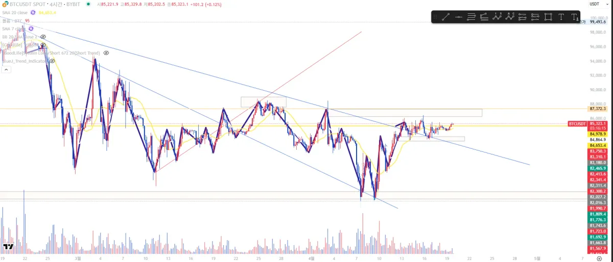 -4시간봉 변곡점 87.3k, 83.2k 사이 박스권 횡보