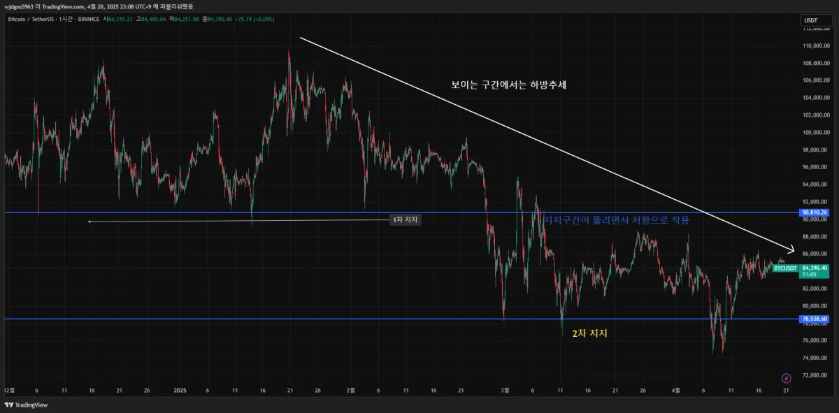 비트코인 1시간봉으로 본 저의 생각으로 작도한 지지,저항라인 및 추세입니다.