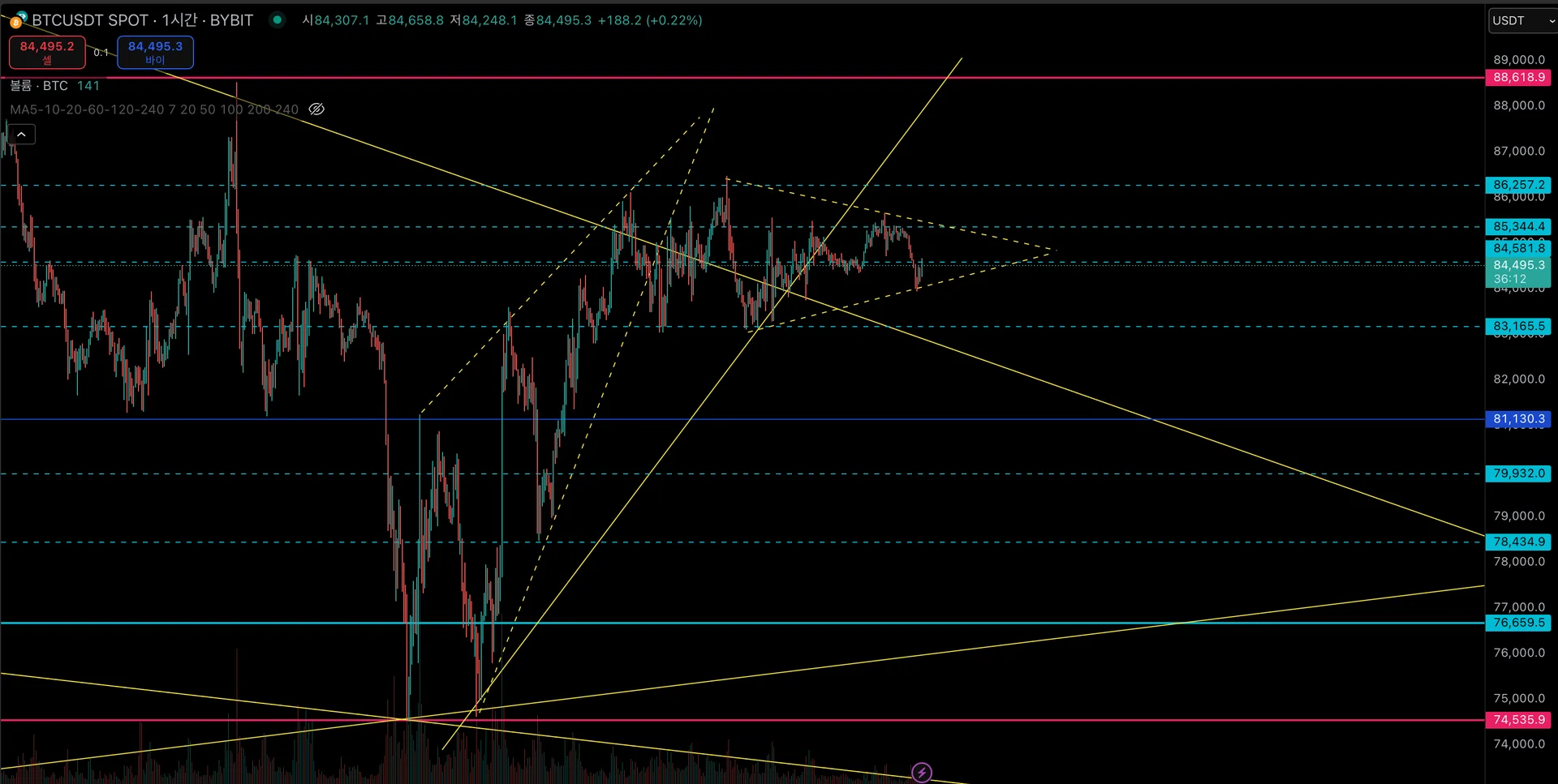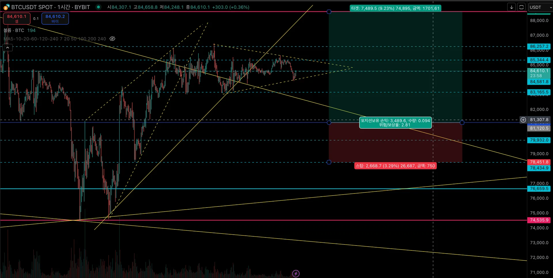단기 삼각수렴이 보이는 현 상태에서, 진입할 근거가 부족하고, 다만 81,000달러 부근 넥라인에 롱포지션 진입 대기는 고려해볼 수 있을 것같습니다.
