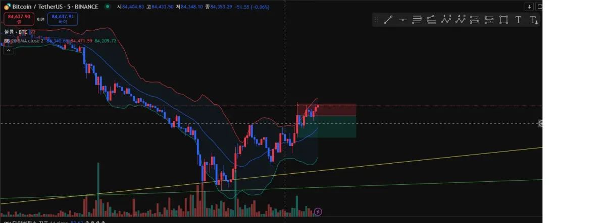 5분봉 차트 기준 볼밴 이탈 캔들 종가에 숏 포지션 진입하였습니다.