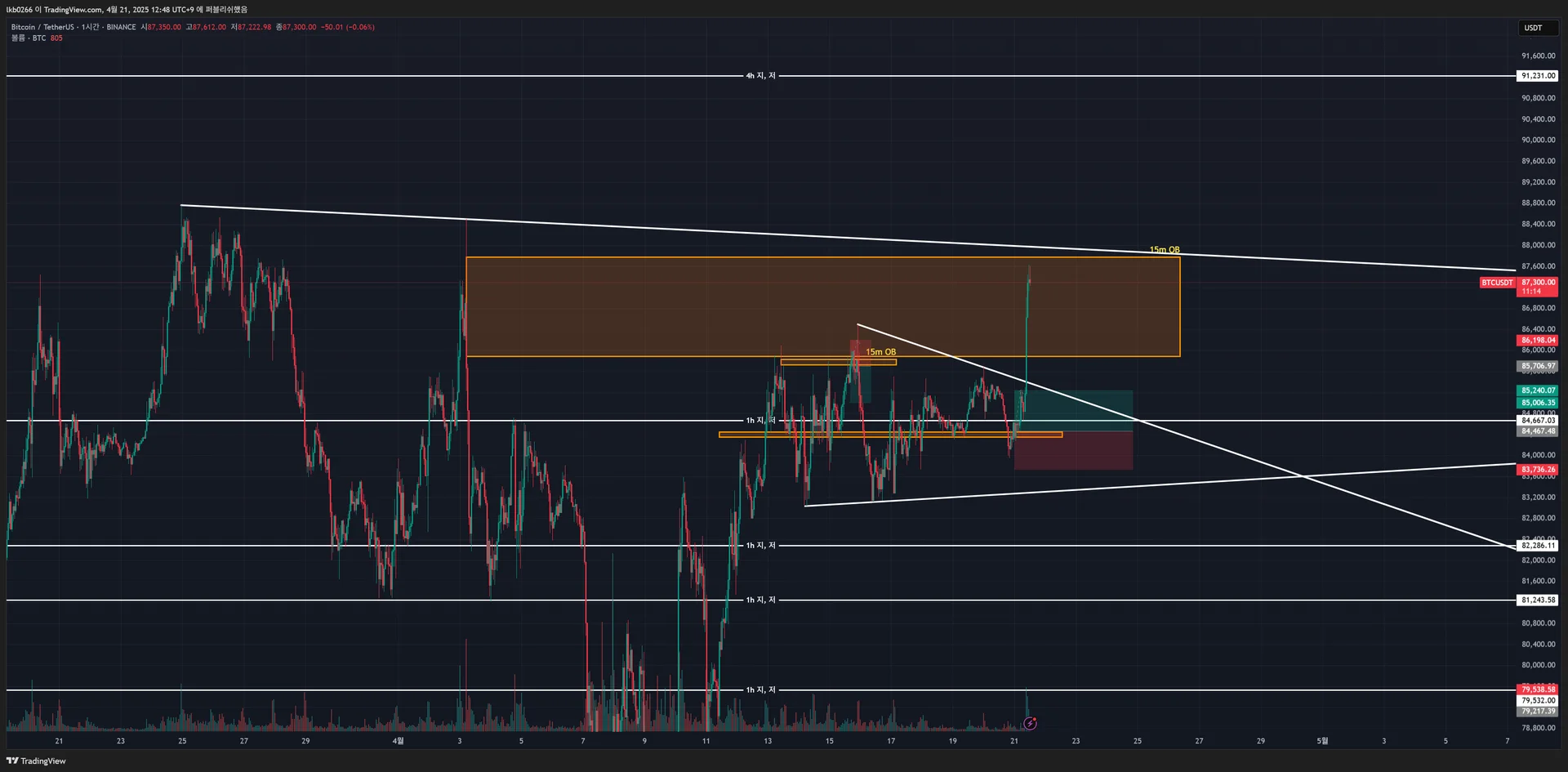 -1h 저항 구간을 맞고 박스 상단에서 머물기에 롱 진입