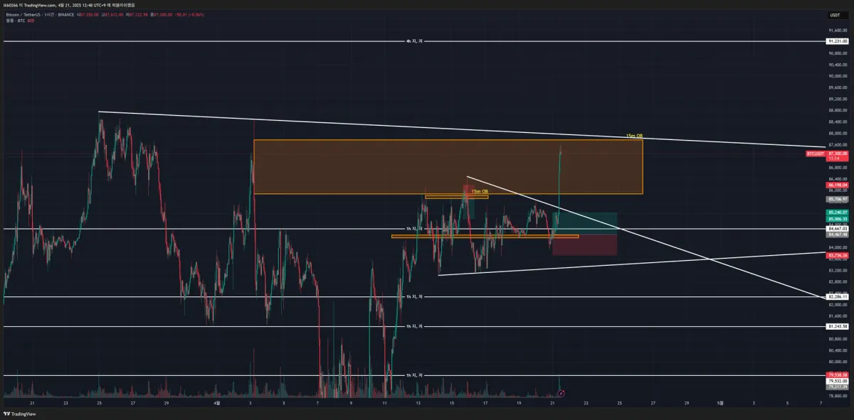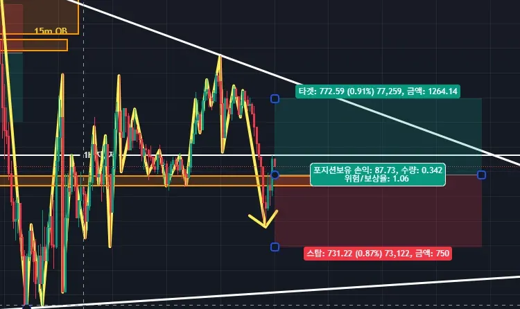 복기: 저점을 높였고 고점은 낮아지고 있었기에 고점을 못 높일 줄 알고 있었는데 큰 양봉으로 위로 치솟아 올라버렸다. OB상단 부근까지 올라갔지만 내 생각과는 좀 달라서 의외였지만 저럴 수도 있구나 경험