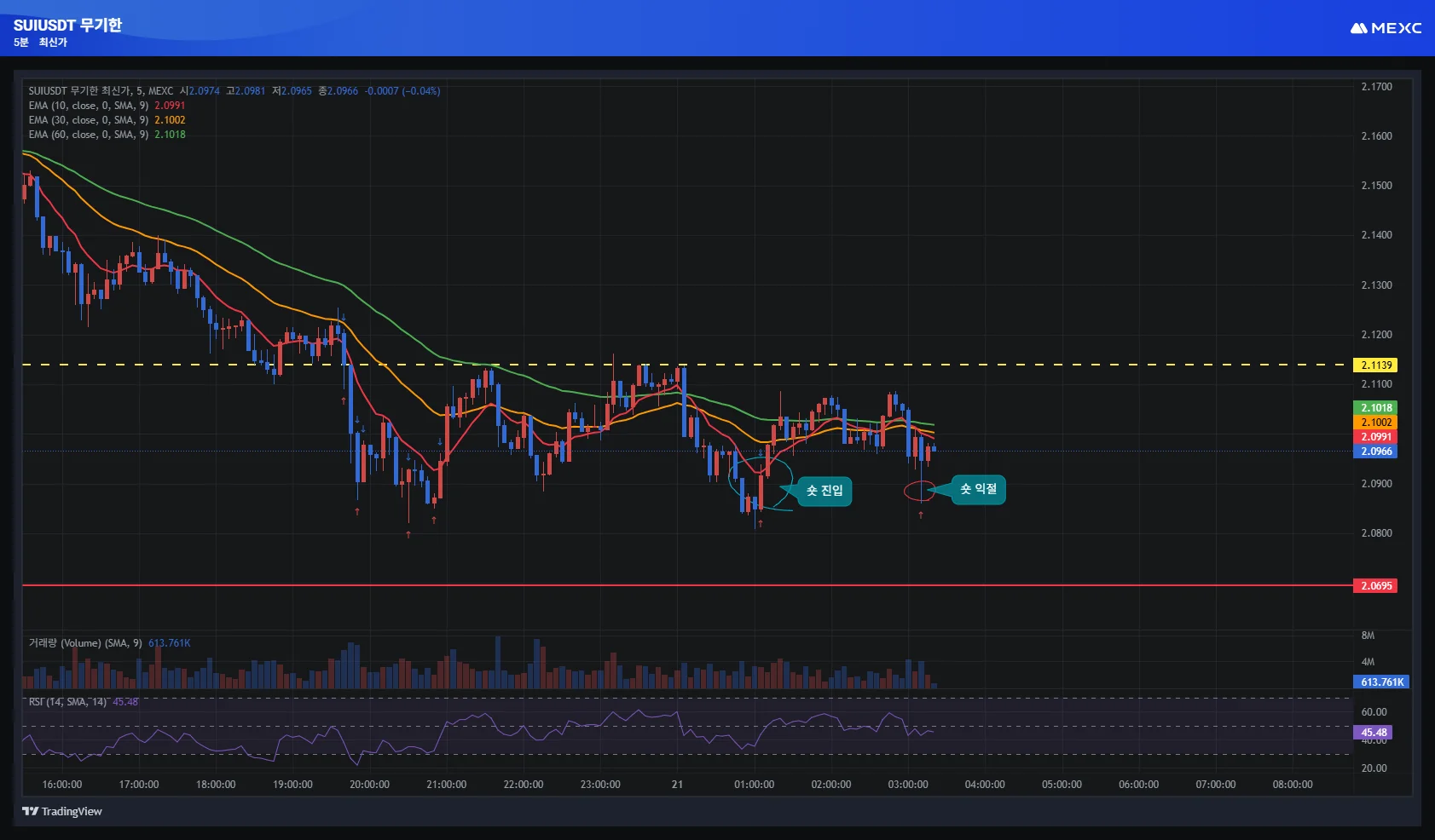 손절까지 가다가 다행히 계속 모니터링 한 결과 결국 수익으로 마무리 했습니다. 숏 진입 시점하자 마자 바로 상승...노란색 손절라인으로 하고 상승의 힘이 약하다 판단 결국 익절로 끝났습니다.