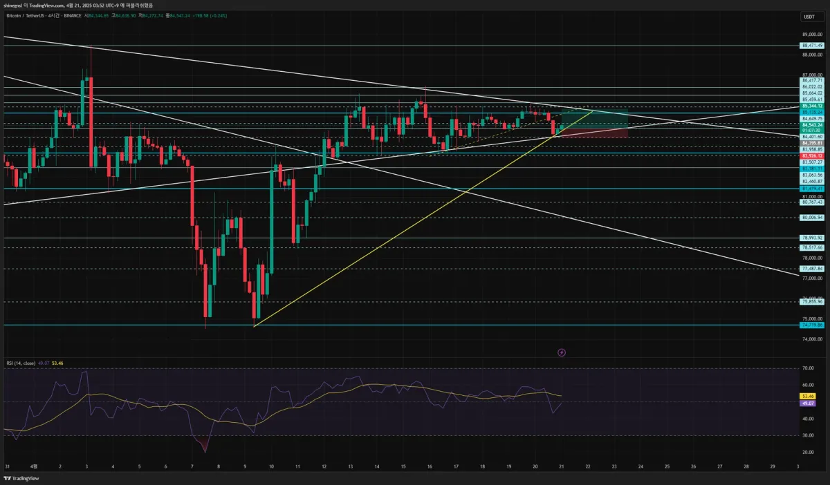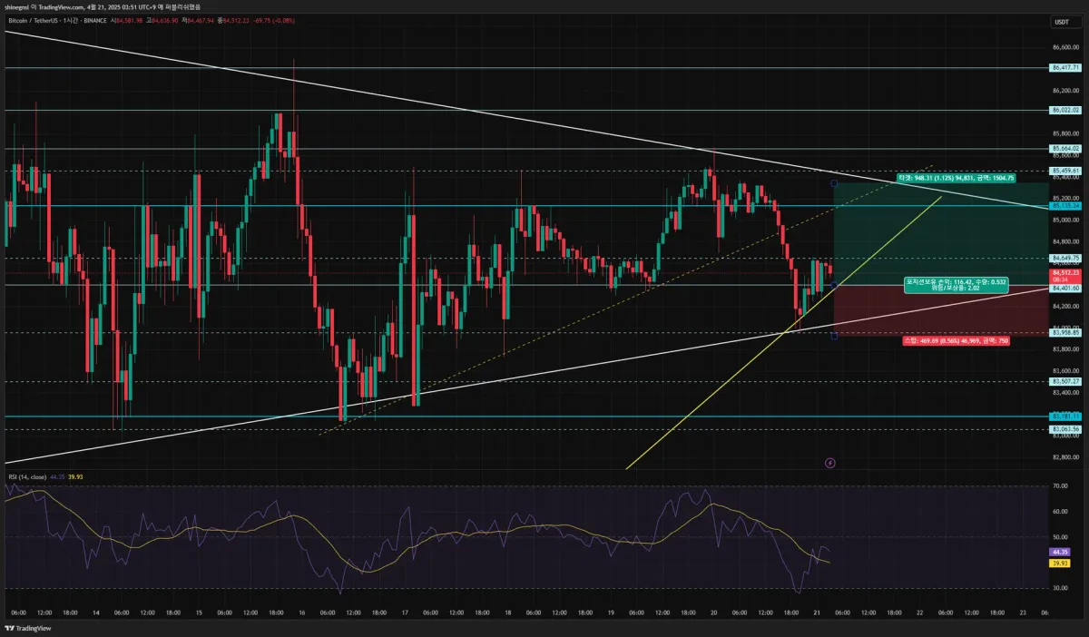 • 하단 1시간봉 저항에서 손절, 상단 1시간봉 추세선과 저항이 맞닿는 지점에서 익절 예정