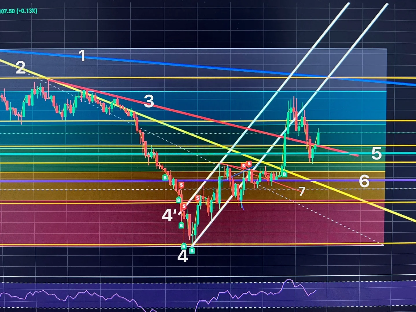 3번(15분 하향추세선)을 긋고 5분봉을 보며 매매를 진행했습니다. 진입은 6번가격에서 하였고, 손절라인은 30분 하향추세선인 2번을 돌파할 시 체결되도록 5번라인으로 설정하였습니다. 잘 보이지는 않지만 7번(5분봉 하락추세선)을 돌파하려는 시도를 하지만 성공하지 못하고 횡보를 하기에 조만간 하락하며 추세를 이어 나가겠다 생각을 했습니다만,