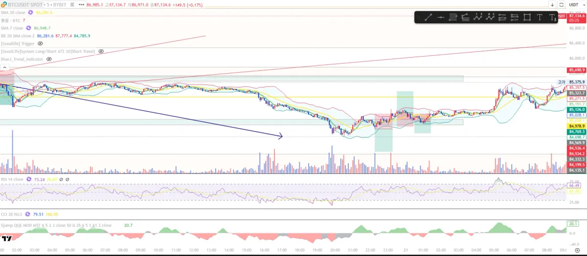 -5분봉 84.3k 지지ob 뚫고 하락했다가 다시 반등