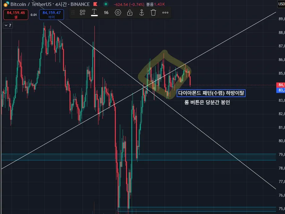 수렴 후 하방 이탈로 숏이 유리하다고 판단. 따라서 숏 자리를 찾았음.