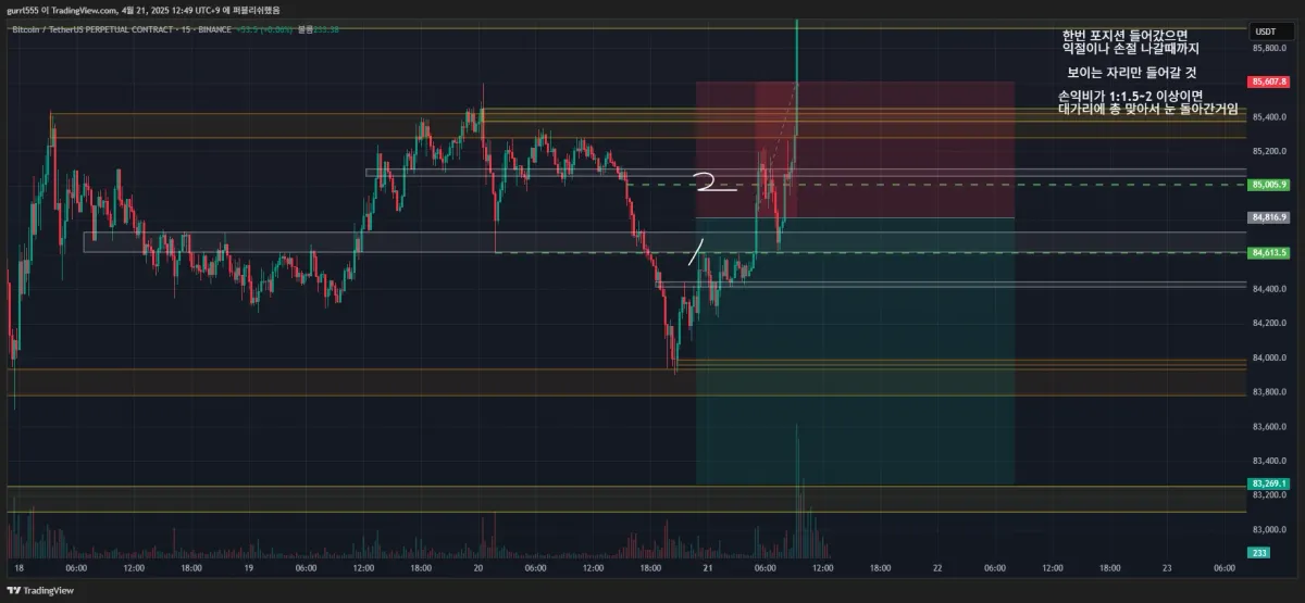 진입 근거 : 흰색 박스 매물대를 기준으로 두번 나눠서 포지션을 진입