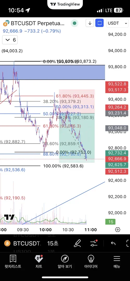 단기 프레임에서의 하락에 대한 61.8되돌림 상승이 나와주었고, 윗꼬리 달리는 캔들 형성을 보면서 61.8 되돌림의 고점 돌파 시 손절로 세팅하고 진입한 숏포지션입니다.