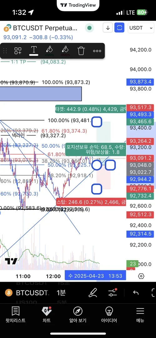 오전 급등 후, RSI도식힐겸 특정 구간 내에서 횡보 할 것이라는 생각을 가지고 있고, 밑에서 올라오는 추세선 기준, 그리고 고점을 높여주지는 못했지만 동일 지점을 두어번 두드린 점 + 상방으로의 단기 반등 예상하여 진입한 롱 포지션 입니다. 단기로는 트레이딩할 만한 자리라고 생각하여 진입했습니다.