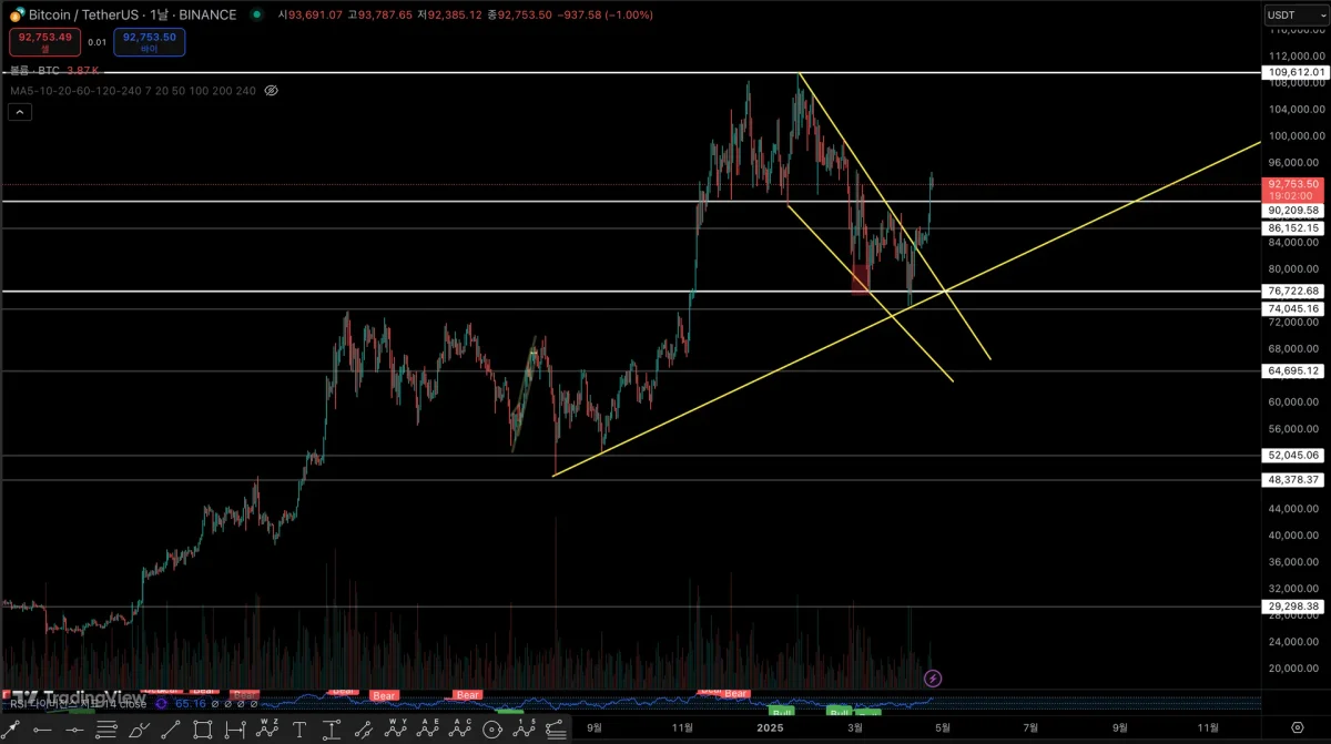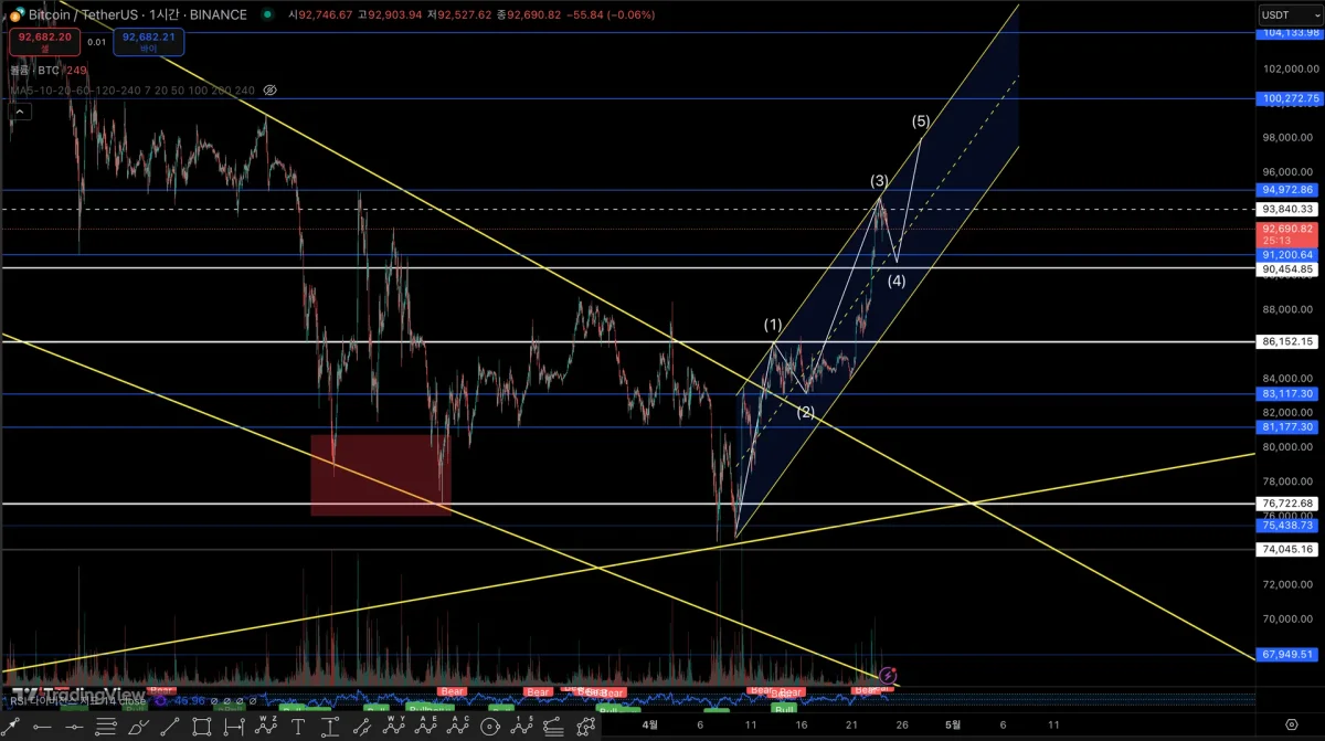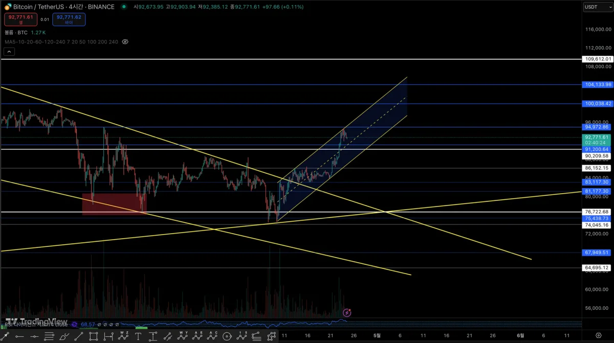 혹은, 4월 23일 저점(91,935달러)부터 분할로 매수할 수도 있겠습니다.