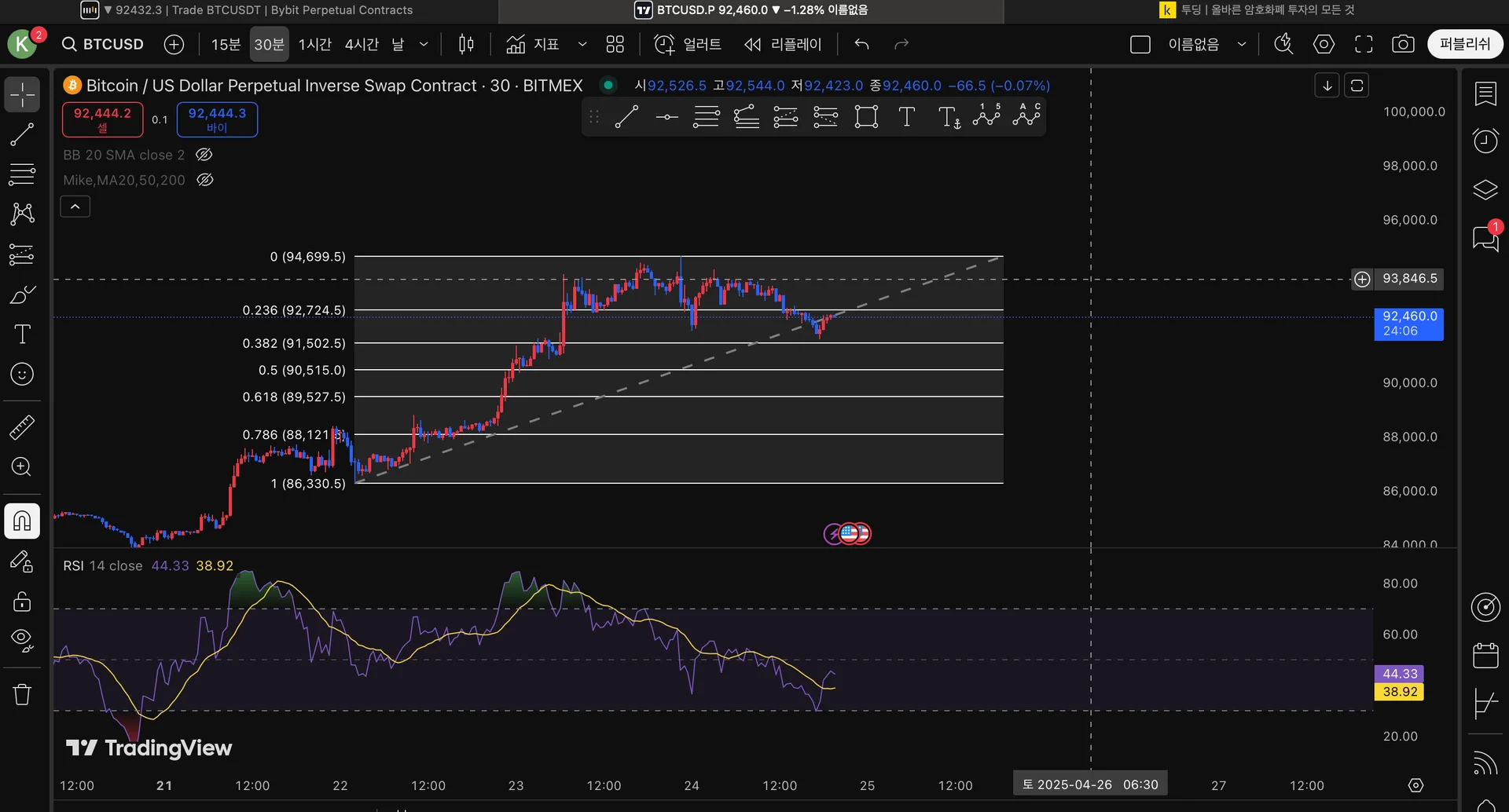 첫 번째 차트 (30분봉 기준): 피보나치 되돌림과 RSI 흐름 현재 상승 이후 조정 구간에서 피보나치 되돌림 0.5~0.618 구간에서 반등 시도를 포착한 것으로 보입니다. 이 구간은 실전에서 흔히 반등이 나오는 핵심 매수 구간입니다. RSI가 과매도권(30 부근)까지 하락한 뒤 반등하려는 흐름은 기술적 반등 가능성을 뒷받침해주며, 가격의 하락 대비 RSI가 더 이상 낮아지지 않는 다이버전스 여부도 확인해보면 좋습니다. 이 상황에서는 추가적인 상승 조건으로 거래량 증가를 동반한 양봉이 나타나면 매수 근거가 강화됩니다. 반대로 거래량 없이 미약하게 반등하는 경우에는 한 번 더 눌림이 나올 수 있어 유의가 필요합니다.