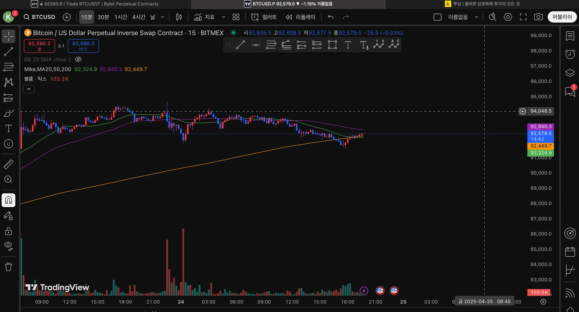 두 번째 차트 (15분봉 기준): 이평선 정배열 시도와 추세 확인 15분봉에서의 200EMA와 500EMA를 기준으로 매수세 복귀를 확인하려는 시도는 실전적으로도 매우 중요합니다. 지금 구간에서는 이평선 재돌파 + 거래량 동반 상승이 확인되어야 비로소 0.236 구간의 지지를 믿고 매수를 이어갈 수 있습니다. 텍스트에서 정리하신 대로, 이 구간에서 상승 추세가 재차 유지될 수 있다고 보기 위해선 단순히 가격의 반등이 아니라 상승 에너지를 확인하는 조건부 반응이 필요합니다.