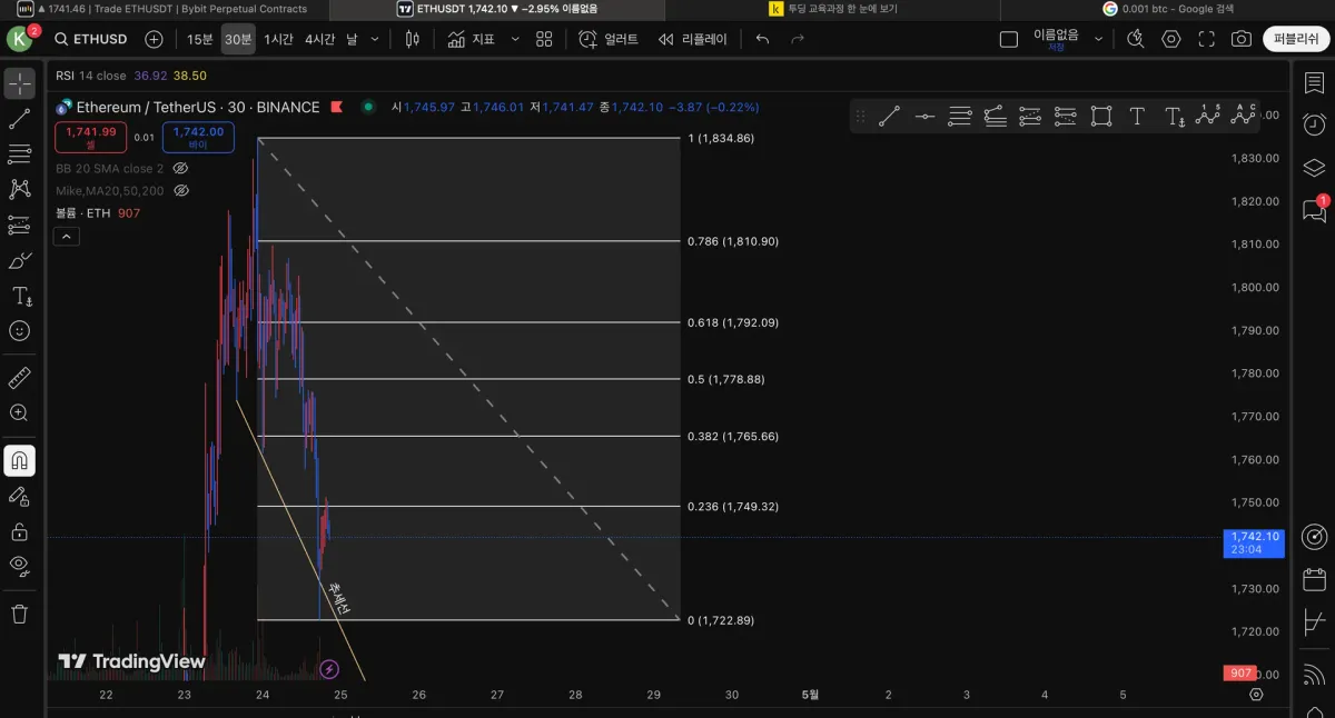 피보나치 후 0.236 부근에서 저항선이 생겨 하락 할 가능성 -> 하락 가능성