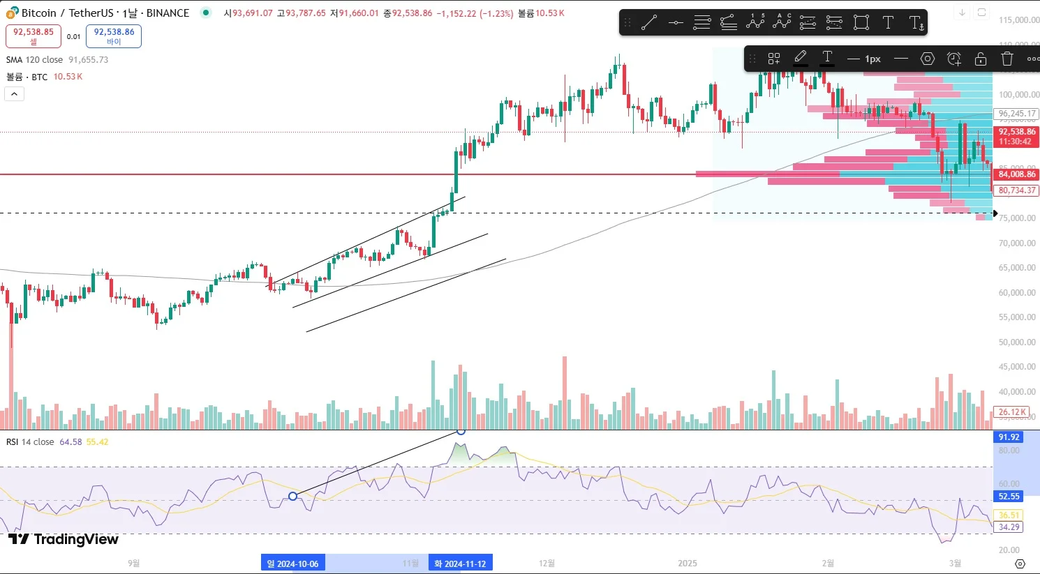 RSI 지표와 거래량 지표를 함께 놓고 상승 흐름을 파악해 보았습니다.