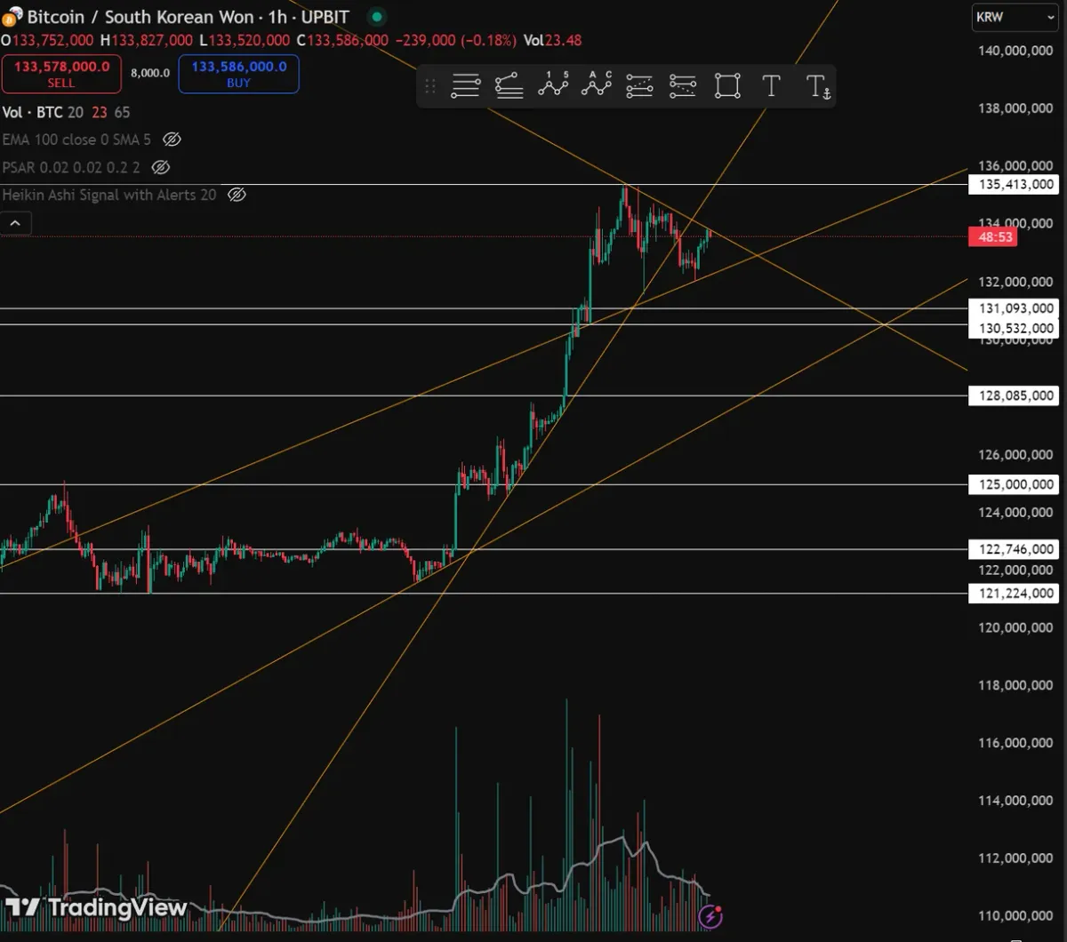 BTCKRW 업비트 1시간 봉에 가로줄 지지/저항 선과 추세선을 그렸다.