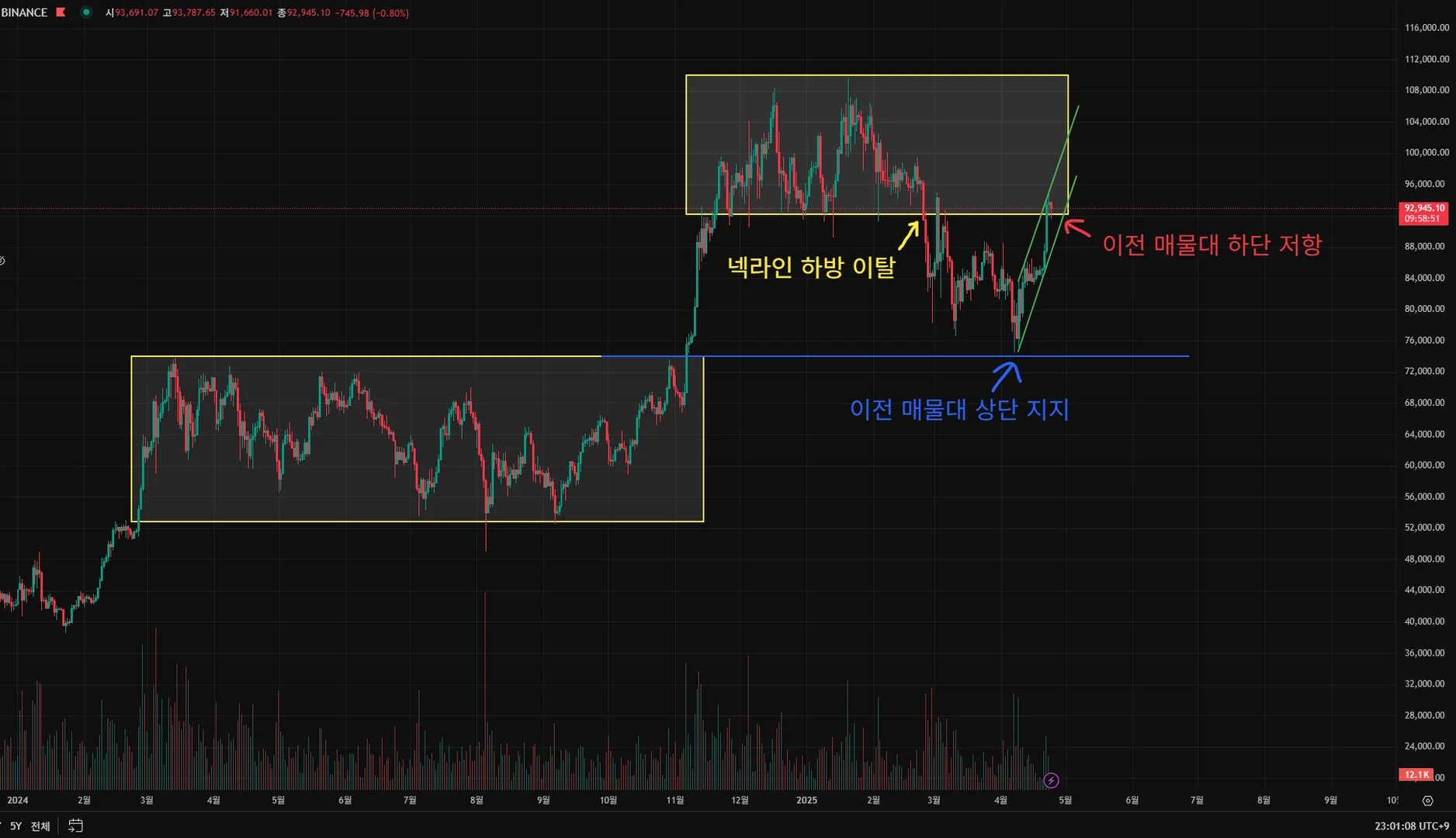 이전 매물대 상단부근인 74K 지지를 받고 상승 추세로 변환되어 94K에서 전 고점 매물대 하단과 상단 추세선 저항이 진행 중