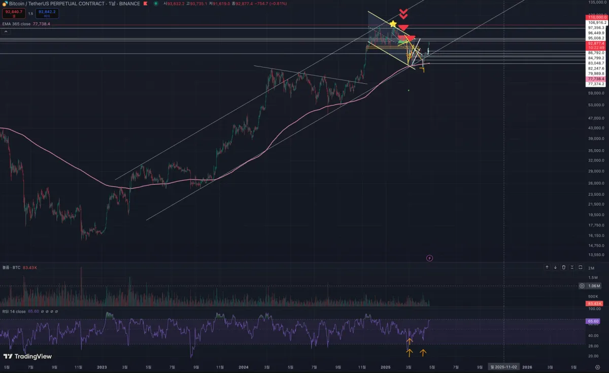2023년 3월부터 365일선을 크게 벗어나지않고 지지하며 저점이 높아지고 있습니다. 2025년 1/20일에 신고가 110K까지 정확히 찍고 조정이 나오면서 잠깐의 하락추세로 돌아섰다가 4/9일 다시 365일선의 지지를 받고 상승하고 있다고 생각합니다.