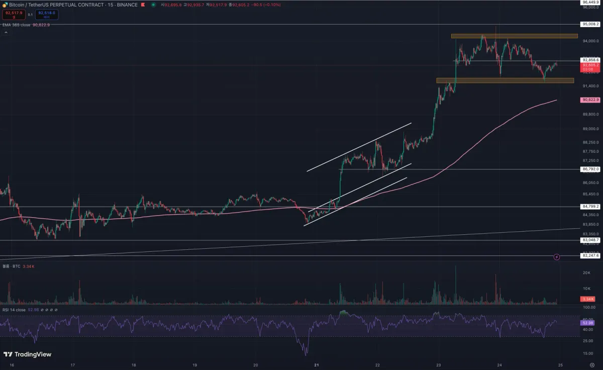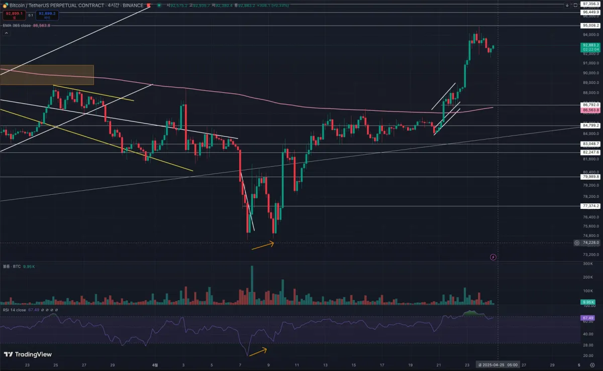일봉에서는 지지를 받았지만 4시간봉에서는 저항점으로 적용되었던 365일선을 4/21일에 크게 상승하며 양봉으로 돌파한 모습입니다. 이후 상승추세로 변환되었다고 생각하나 95K에서 저항을 받고 조정중이며 91K-89K에서 지지를 받는다면 다시 상승할것으로 예상합니다.