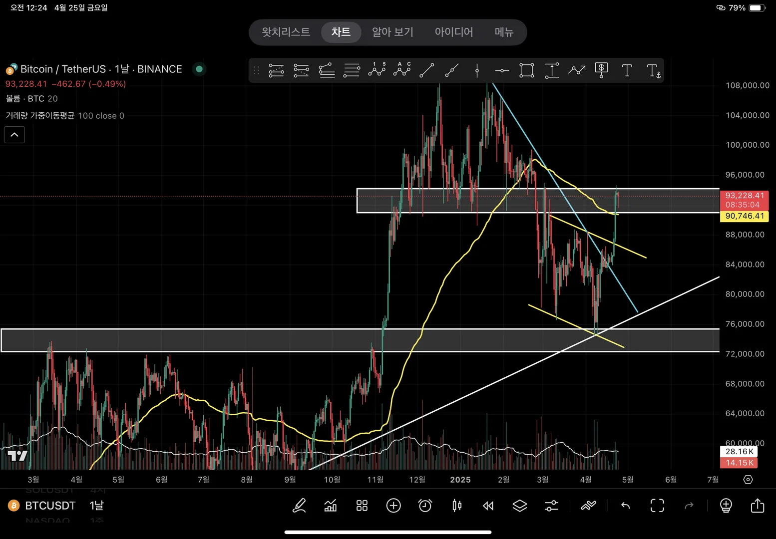 하늘색 추세선과 노란색 채널 모두 장대양봉으로 돌파한 것을 보아 추세를 전환했다고 볼 수 있으나 현재 주요 저항 자리를 돌파할 지 저항을 맞고 하락할 지 좀 더 관망해야할 것 같습니다. 채널 상단에 리테스트 후 상승하는 시나리오 또한 생각해봐야 할 것 같습니다.