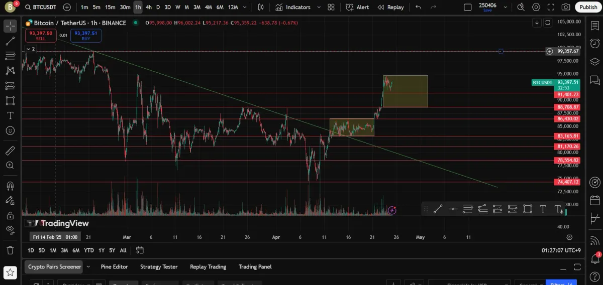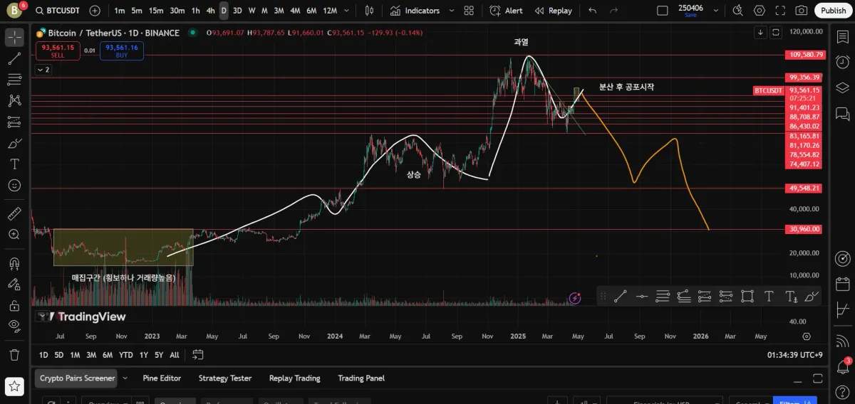 현재 트럼프빔을 쏘았던 지점 95k~88k (상승을하였으나 눌림구간이없음) 을 횡보한 후 상방 도전 후 하락한다는 시나리오를 생각해봤습니다