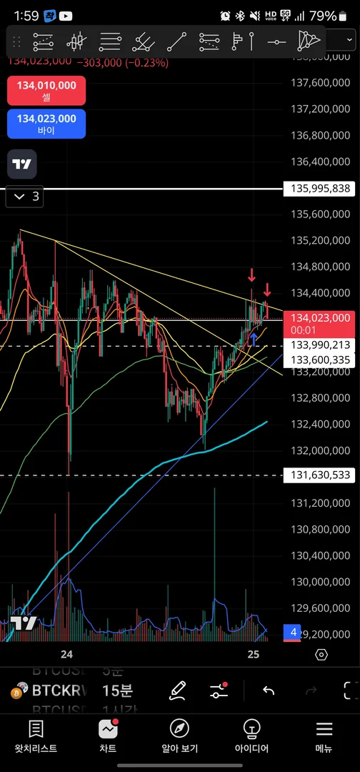 이번 매매는 업비트의 비트코인 차트로 기본 추세선, 지지저항선 작도와 거래량만 보고 진행했습니다.