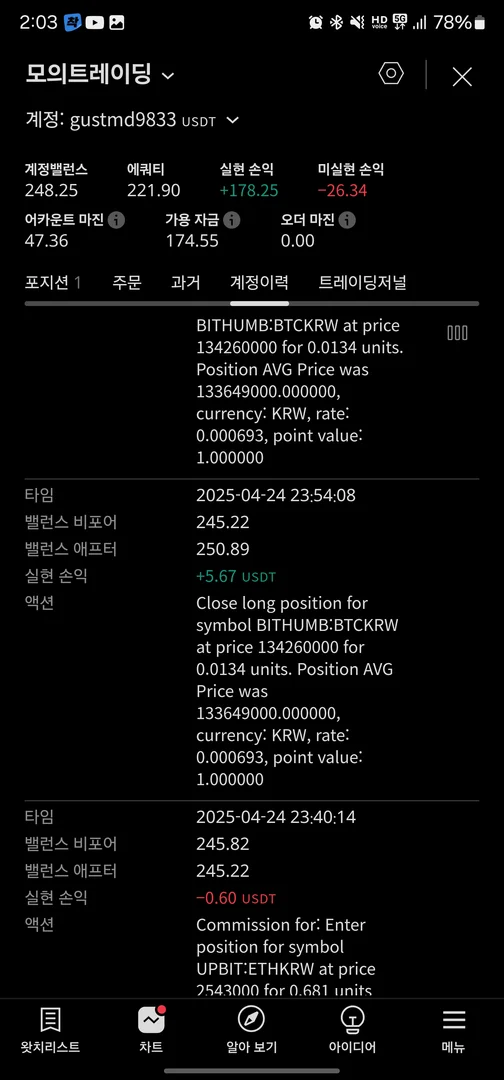 래버리지 50배로 모의트레이딩 진행중입니다.