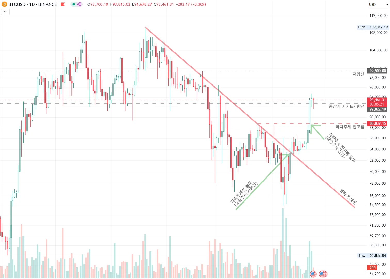 하지만 93k 지지에 실패하더라도, 이미 상승추세에 진입했음을 근거로 전고점인 88.8k가 강력한 지지선으로 작용할 가능성을 예상해 봅니다.