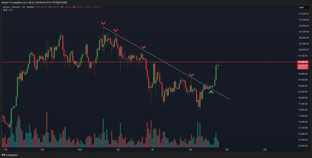 2025년 1월경 최고 고점으로부터 하락 저항선이 형성됨. (흰색 추세선)