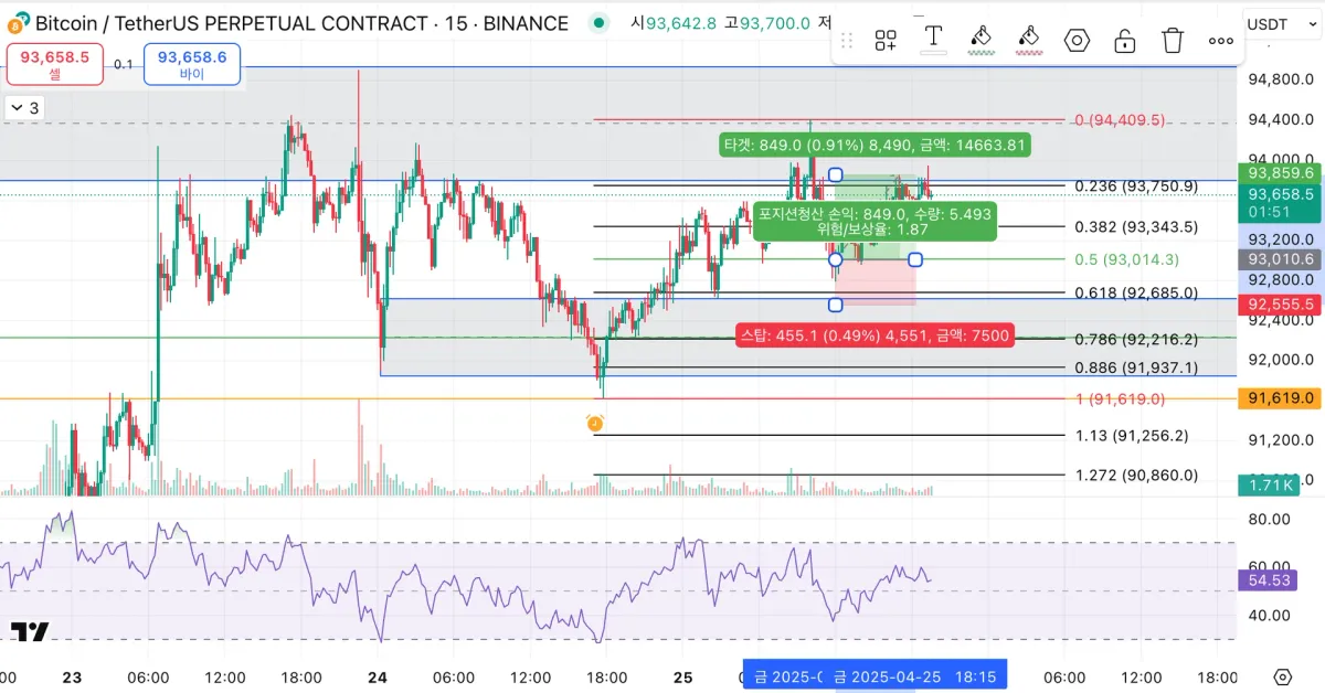 - 24일 18시부근 저점부터 25일 고점까지의 피보나치를 그렸고 상승 되돌림의 0.5 구간에서 가격 거부반응을 생각하고 롱포지션 진입