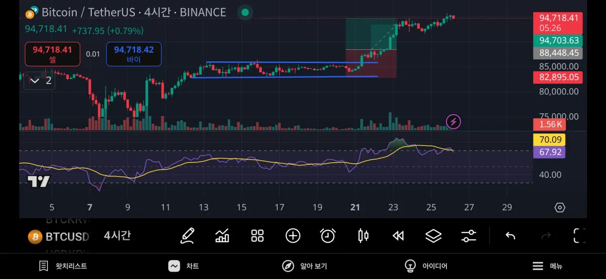 비트코인이 조정이후에 채널을 뚫으며 상승을 하는 불플래그 패턴이 형성되었다고 생각해서 롱포지션으로 모의투자를 해봤습니다. 스탑로스는 채널하단에 걸어놨습니다. 하지만 손익비를 제대로 설정못하고, tp 를 설정안한점, 단편적인 정보로 많은 비중을 쓴 점등 운에 의존하여 투자를 한 거 같습니다. 많이 반성하고, 훨씬 많은 공부를 해야겠습니다..