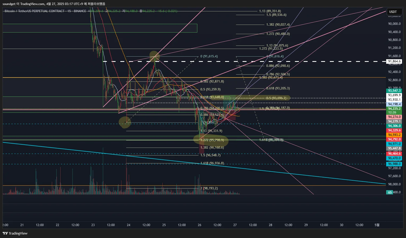 진입:94259.9/스탑:94792.04/익절:93547.3/손익비 1:1.4.3------------------->익절가 93701로 변경 (사유:상승과 하락의 반등의 피보나치 0.5)