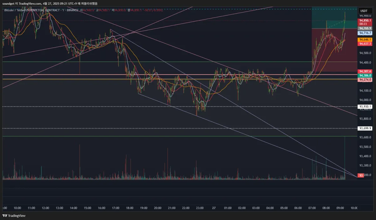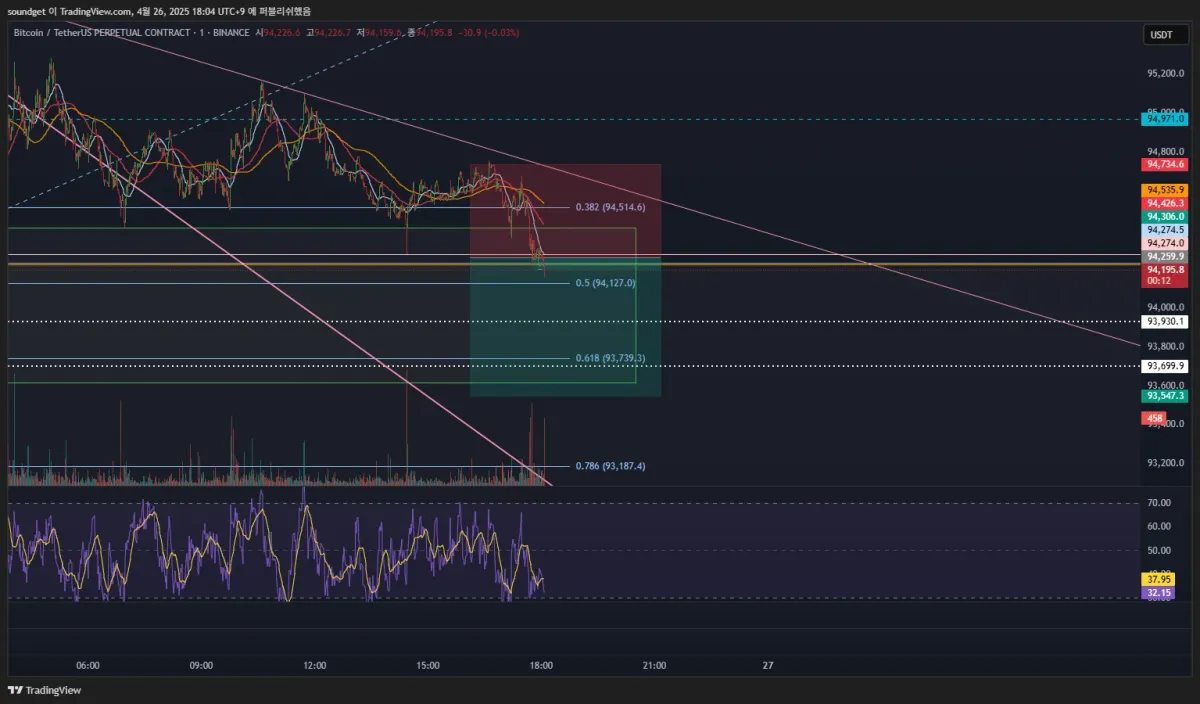 진입:94259.9/스탑:94792.04/익절:93547.3/손익비 1:1.4.3------------------->익절가 93701로 변경 (사유:상승과 하락의 반등의 피보나치 0.5)