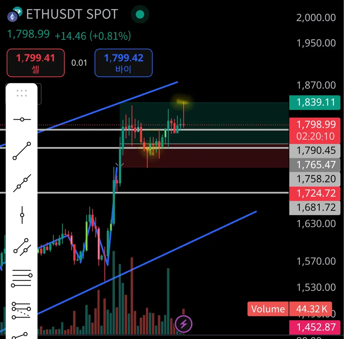 분석한 차트대로 그래프의 하락, 상승이 갱신 되는지 살핌. 상승 구간이라 판단함. 추세선과 전 그래프의 최고 가격을 근거로 익절, 손절라인 정함.