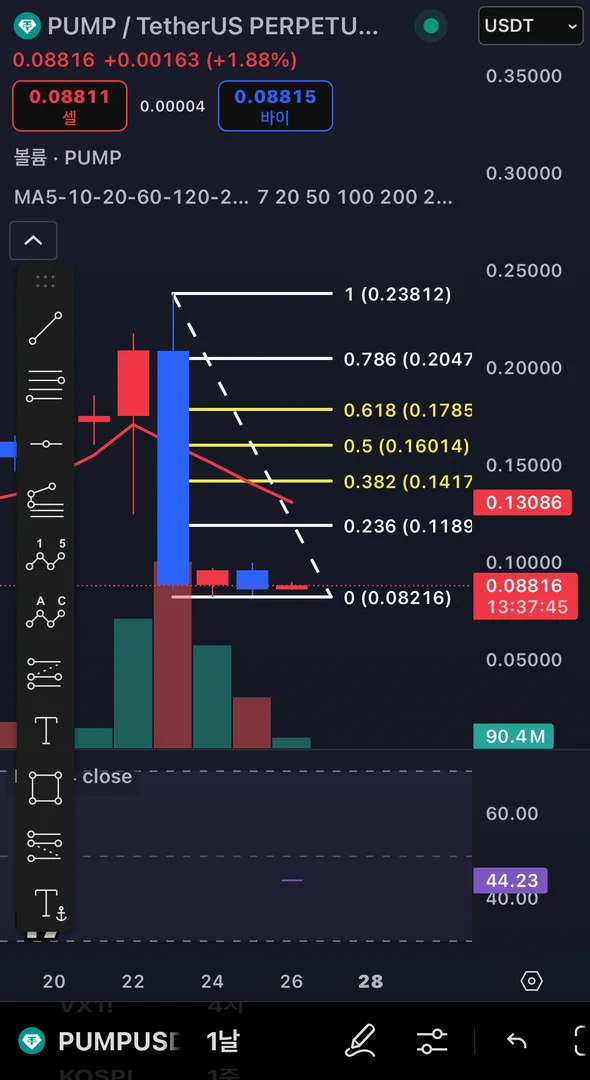 Deep이랑 Pump는 업비트 빗썸 상장이후 숏 포지션으로 수익 났습니다. 그전에는 익절을 언제 해야하나 항상고민이였는데 피보나치를 활용해서 보수적으로 익절했습니다. 차트상 날봉 피보나치지만 실제로 매매 했을때는 1시간봉으로 하였습니다.